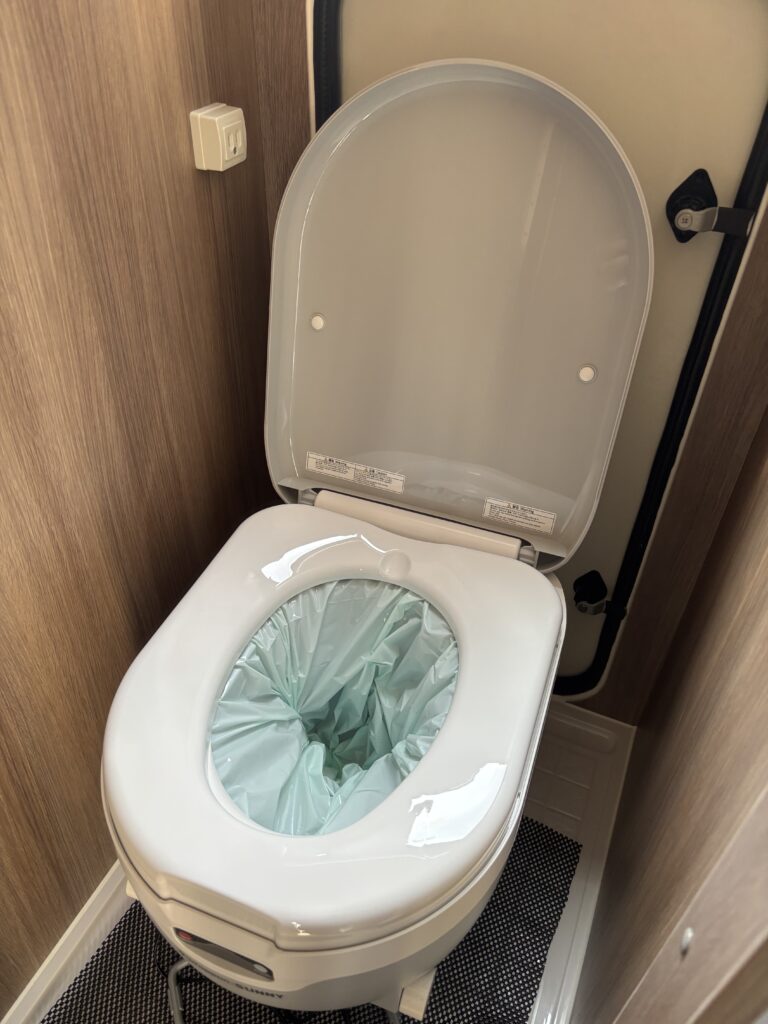 ところで、キャンピングカーのトイレは、必要派と不要派のまっぷたつに分かれるとのことです。私は最初は不要派でしたが「雨の夜に外のトイレに行くのは大変かも」とか「夏の夜のトイレは虫がすごいことになっているかも」等という思いが強くなったことや、処理に手間のかからないラップ式トイレの存在を知ったことなどから、あっけなくトイレ必要派に宗旨替えをして、「ラップポンサニー」を購入するとともに、マルチルームへのコンセント設置を追加オプションでお願いしたりしてました。
